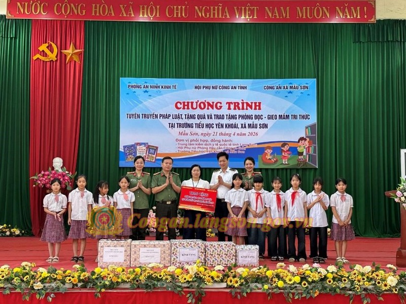 Ngày 21/4/2026, Phòng An ninh kinh tế phối hợp với Hội Phụ nữ Công an tỉnh, Công an xã Mẫu Sơn và Trung tâm Kiểm dịch y tế quốc tế tỉnh tổ chức chương trình trao tặng “Phòng đọc sách - gieo mầm tri thức” tại Trường Tiểu học Yên Khoái, xã Mẫu Sơn.