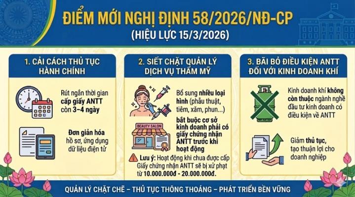 Ngày 13/02/2026, Chính phủ đã ban hành Nghị định số 58/2026/NĐ-CP sửa đổi, bổ sung một số quy định liên quan đến ngành, nghề đầu tư kinh doanh có điều kiện về an ninh, trật tự. Nghị định có hiệu lực thi hành từ ngày 15/3/2026, với nhiều nội dung mới quan trọng, tác động trực tiếp đến cơ quan quản lý nhà nước và tổ chức, cá nhân kinh doanh.