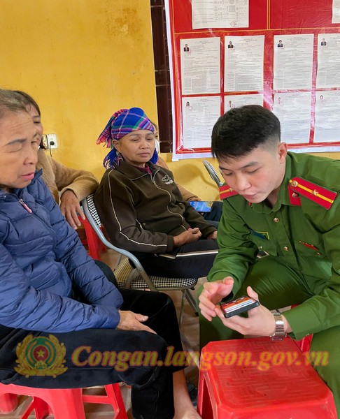Cán bộ Công an xã Tuấn Sơn hướng dẫn người dân cài đặt ứng dụng báo cháy 114