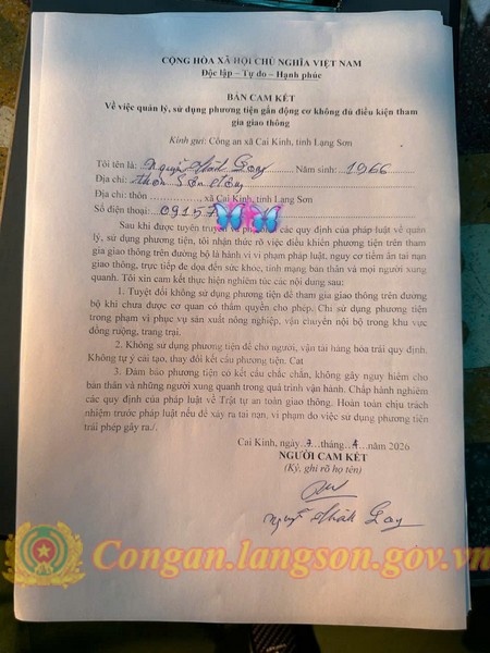 Những ngày qua, lực lượng Công an xã Cai Kinh đã trực tiếp xuống từng hộ gia đình, gặp gỡ từng người dân để tuyên truyền, phổ biến pháp luật và tổ chức ký cam kết chấp hành nghiêm các quy định về an toàn giao thông như: không điều khiển phương tiện giao thông trên đường bộ khi chưa được cơ quan có thẩm quyền cấp GPLX, không sử dụng phương tiện để chở người, vận tải hàng hóa trái quy định, không tự ý cải tạo, thay đổi kết cấu phương tiện, chỉ sử dụng phương tiện không đủ điều kiện tham gia giao thông trong phạm vi phục vụ sản xuất nông nghiệp, vận chuyển nội bộ khu vực đồng ruộng, trang trại.