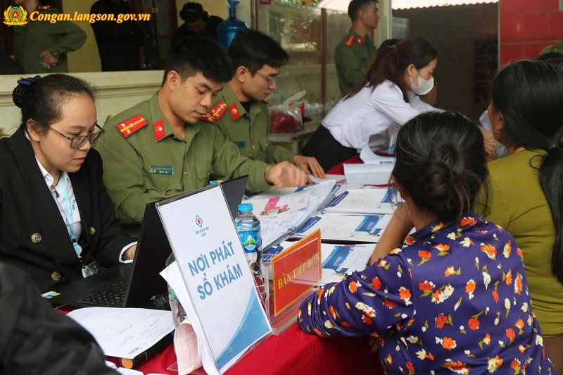 Người dân đến khám chữa bệnh miễn phí được các cán bộ chiến sĩ Công an tỉnh Lạng Sơn hướng dẫn, hỗ trợ tận tình