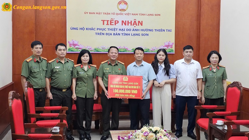 Thay mặt Đảng ủy, Lãnh đạo Công an tỉnh và toàn thể cán bộ, chiến sĩ Công an Lạng Sơn, Đại tá Triệu Tuấn Hải, Phó Bí thư Đảng ủy, Phó Giám đốc Công an tỉnh đã trao tặng số tiền 100.000.000đ tới UBND tỉnh để chuyển tới bà con Nhân dân bị ảnh hưởng do lũ lụt. Món quà tuy không lớn nhưng thể hiện tấm lòng, tình cảm và trách nhiệm của cán bộ, chiến sĩ Công an Lạng Sơn đối với Nhân dân, mong góp phần nhỏ giúp bà con sớm khắc phục khó khăn, khôi phục sản xuất sau thiên tai, ổn định cuộc sống./.