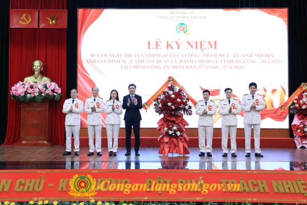 Đồng chí Giám đốc Công an tỉnh và các đồng chí lãnh đạo, nguyên lãnh đạo Công an tỉnh tặng hoa chúc mừng Công an huyện Hữu Lũng