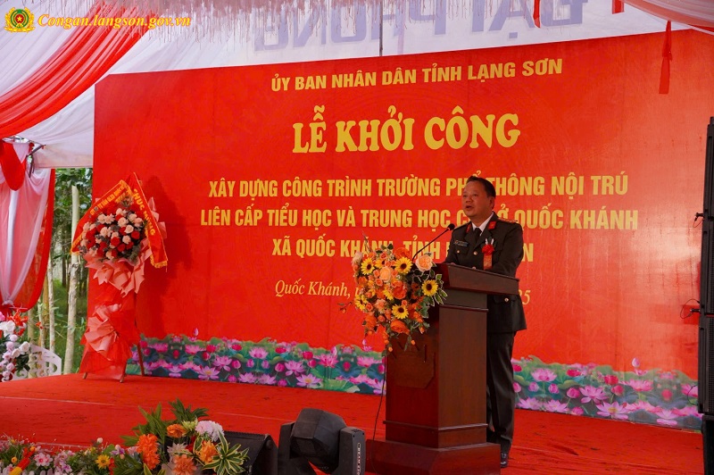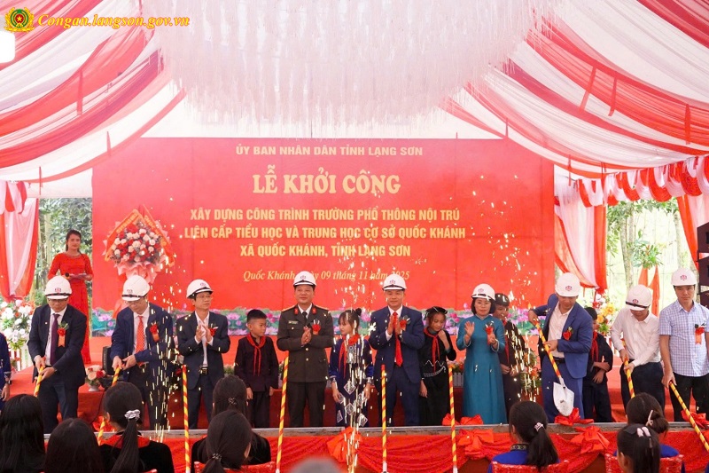 Sáng ngày 09/11/2025, tại xã Quốc Khánh, tỉnh Lạng Sơn, Công an tỉnh tham mưu UBND tỉnh tổ chức Lễ khởi công công trình Trường Phổ thông nội trú liên cấp Tiểu học và Trung học cơ sở Quốc Khánh. Dự buổi lễ có Đại tá Triệu Tuấn Hải, Phó Bí thư Đảng uỷ, Phó Giám đốc Công an tỉnh; đại diện lãnh đạo một số sở, ban, ngành của tỉnh; lực lượng vũ trang trên địa bàn; đại diện đơn vị thi công, tư vấn giám sát; lãnh đạo cấp ủy, chính quyền, Nhân dân xã Quốc Khánh.