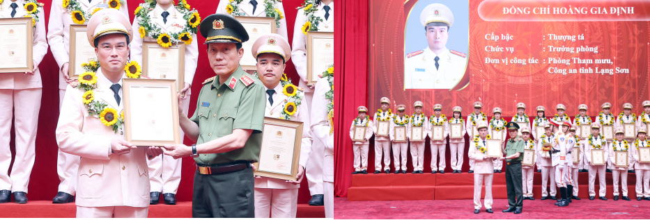 Đồng chí Thượng tá Hoàng Gia Định - Trưởng phòng Tham mưu Công an tỉnh Lạng Sơn được Đại tướng Lương Tam Quang - Ủy viên Bộ Chính trị, Bộ trưởng Bộ Công an trao Quyết định công nhận cá nhân điển hình tiên tiến của lực lượng Tham mưu CAND