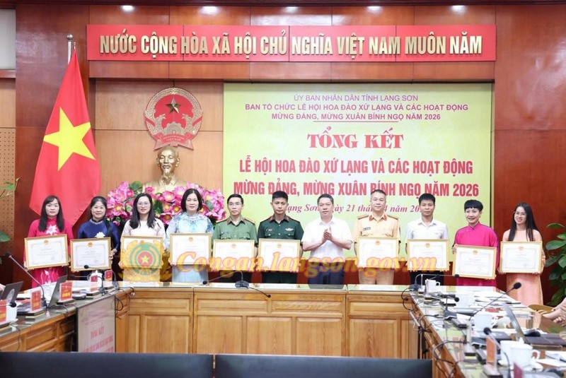 Sáng ngày 21/4/2026, Chủ tịch UBND tỉnh đã tặng Bằng khen cho 02 tập thể và 02 cá nhân thuộc Công an tỉnh có thành tích xuất sắc trong công tác tổ chức, thực hiện Lễ hội Hoa đào xứ Lạng và các hoạt động Mừng Đảng, Mừng Xuân 2026. Đây là sự sự động viên, ghi nhận kịp thời đối với những nỗ lực không mệt mỏi của lực lượng Công an trong việc bảo đảm an ninh trật tự (ANTT), góp phần tạo nên một mùa lễ hội an toàn, lành mạnh, phục vụ nhân dân và du khách vui xuân, trẩy hội.