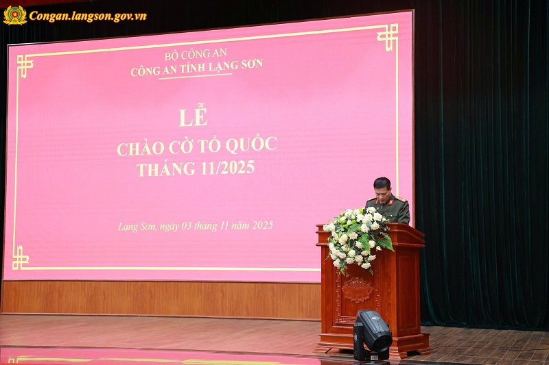 Sáng ngày 03/11/2025, Công an tỉnh Lạng Sơn tổ chức Lễ chào cờ tháng 11/2025, tuyên dương, khen thưởng các tập thể, cá nhân có thành tích xuất sắc trong công tác phòng, chống tội phạm. Đồng chí Đại tá Nguyễn Xuân Thu, Phó Giám đốc Công an tỉnh chủ trì buổi lễ. Dự buổi lễ có các đồng chí trong Ban Thường vụ Đảng ủy, Lãnh đạo Công an tỉnh; lãnh đạo các phòng nghiệp vụ và Công an các đơn vị, địa phương.