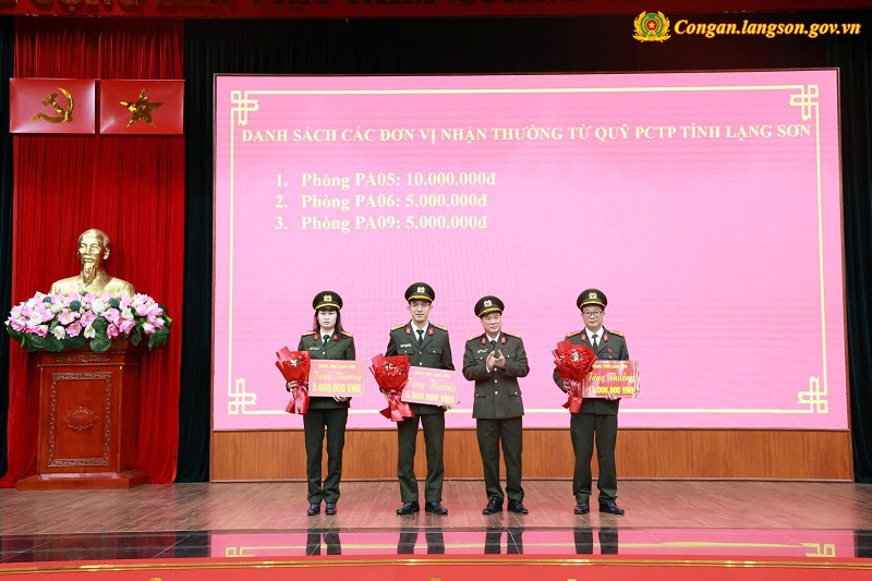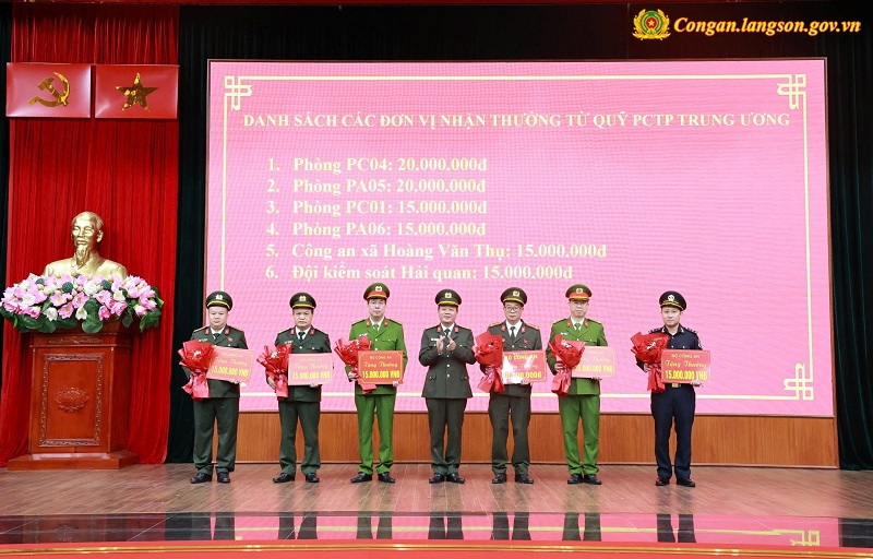 Đồng chí Đại tá Nguyễn Xuân Thu, Phó Giám đốc Công an tỉnh trao thưởng cho các tập thể, cá nhân từ Quỹ phòng, chống tội phạm tỉnh Lạng Sơn