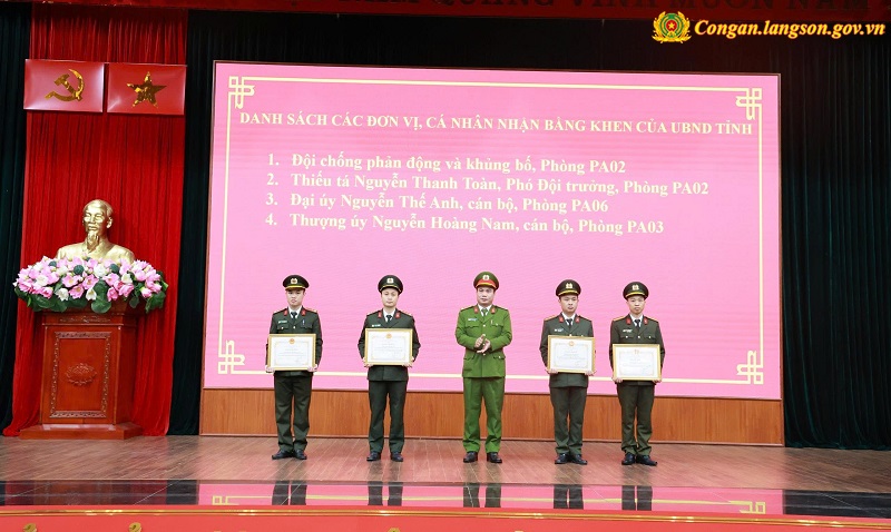 Thừa ủy quyền của Bộ Công an, Lãnh đạo Công an tỉnh đã trao thưởng 100 triệu đồng từ Quỹ Phòng, chống tội phạm Trung ương cho 5 tập thể; trao 20 triệu đồng từ Quỹ Phòng, chống tội phạm tỉnh cho 3 tập thể có thành tích xuất sắc. Dịp này, 1 tập thể, 4 cá nhân được nhận Bằng khen của Chủ tịch UBND tỉnh; 2 tập thể, 10 cá nhân thuộc lực lượng Công an xã được Giám đốc Công an tỉnh tặng Giấy khen.