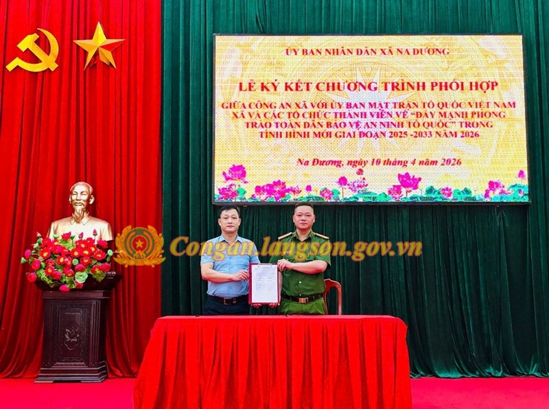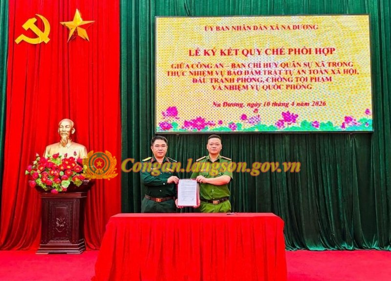 Nhằm nâng cao hiệu quả công tác phối hợp giữa các lực lượng trong bảo đảm an ninh, trật tự, ngày 10/4/2026, Công an xã Na Dương đã tham mưu Ủy ban nhân dân xã tổ chức Lễ ký kết chương trình phối hợp giữa Công an xã với Ủy ban Mặt trận Tổ quốc Việt Nam xã và các tổ chức thành viên về “Đẩy mạnh phong trào Toàn dân bảo vệ an ninh Tổ quốc” trong tình hình mới; đồng thời ký kết quy chế phối hợp giữa Công an xã với Ban Chỉ huy Quân sự xã trong thực hiện nhiệm vụ bảo đảm trật tự, an toàn xã hội, đấu tranh phòng, chống tội phạm và nhiệm vụ quốc phòng.