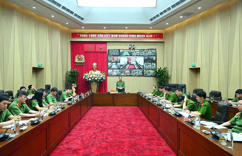 Hội nghị được kết nối trực tuyến từ điểm cầu Hội trường Bộ Công an (Hà Nội) đến điểm cầu Hội trường Công an các tỉnh, thành phố và Công an cấp xã trên toàn quốc.