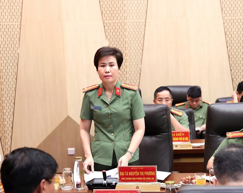 Đại tá Nguyễn Thị Phương, Phó Chánh Văn phòng Bộ Công an báo cáo tóm tắt kiểm điểm, đánh giá công tác bảo đảm an ninh, trật tự, y tế Lễ mở ký.