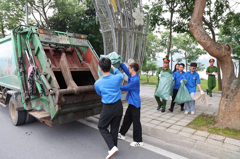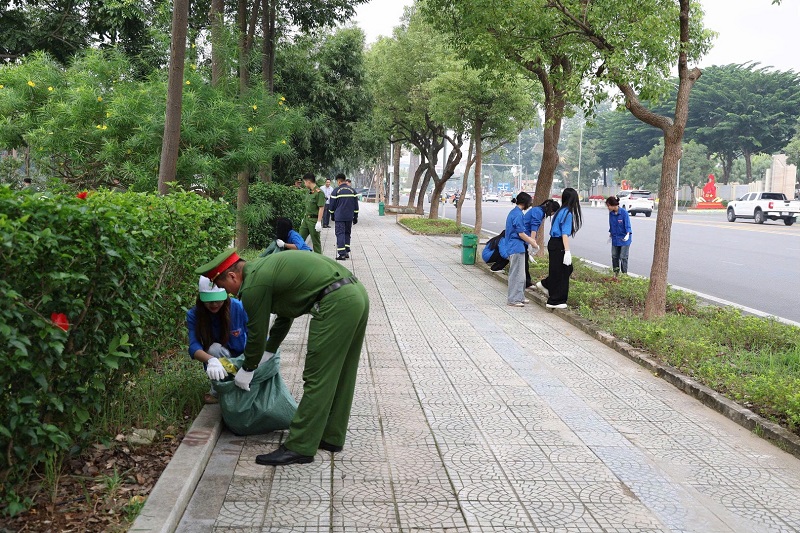 Đoàn viên thanh niên Công an tỉnh Phú Thọ cùng các sinh viên trường Đại học Hùng Vương thu gom rác thải nhựa tại khu vực Công viên Văn Lang.