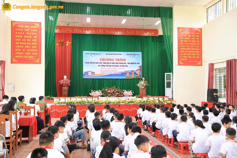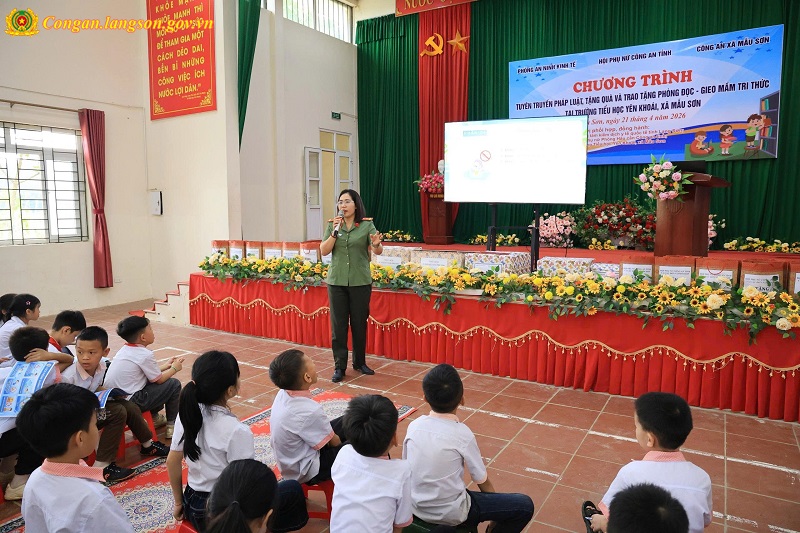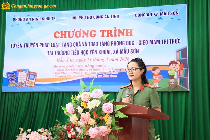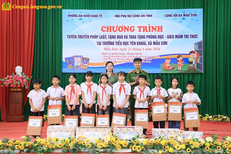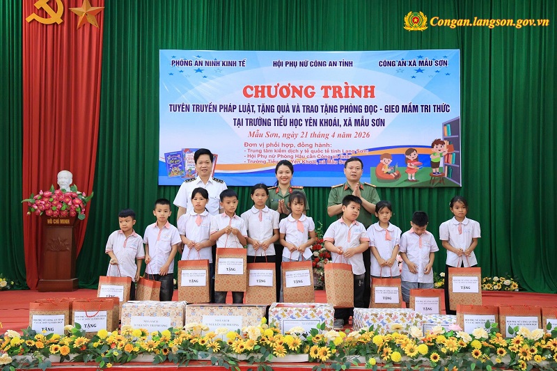 Sáng 21/4, Hội Phụ nữ Công an tỉnh Lạng Sơn phối hợp với Phòng An ninh kinh tế, Công an xã Mẫu Sơn và Trung tâm Kiểm dịch y tế quốc tế tỉnh tổ chức chương trình tuyên truyền pháp luật, tặng quà và trao tặng phòng đọc - gieo mầm tri thức tại Trường Tiểu học Yên Khoái, xã Mẫu Sơn. Tham dự chương trình có đại diện lãnh đạo, cán bộ, hội viên các đơn vị cùng hơn 450 học sinh, giáo viên nhà trường.