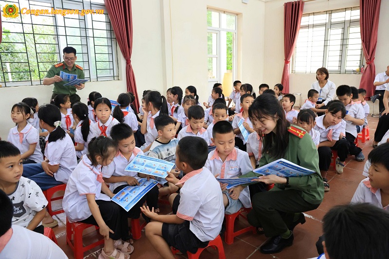 Cán bộ Phòng an ninh Kinh tế phát tờ rơi, hướng dẫn học sinh cách phòng chống tai nạn đuối nước