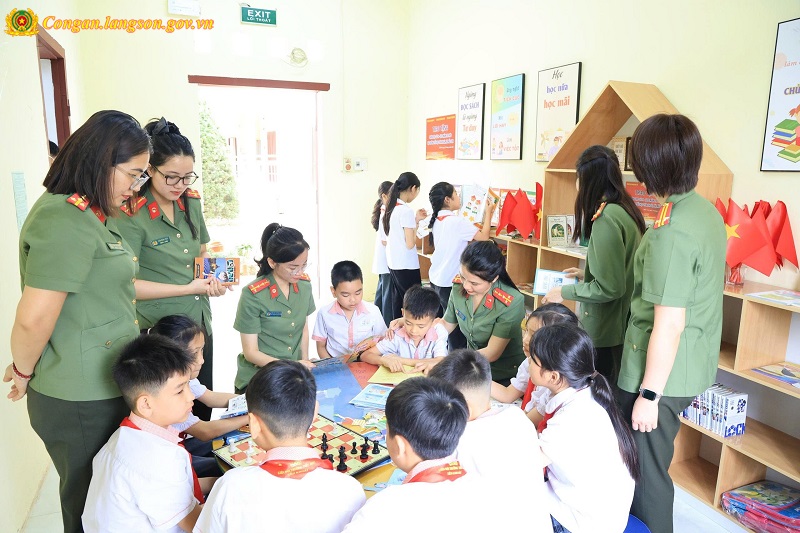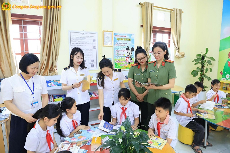 Cán bộ, hội viên Phụ nữ Công an tỉnh và Trung tâm Kiểm dịch y tế quốc tế tỉnh cùng các em học sinh tham gia đọc sách, lan tỏa văn hóa đọc