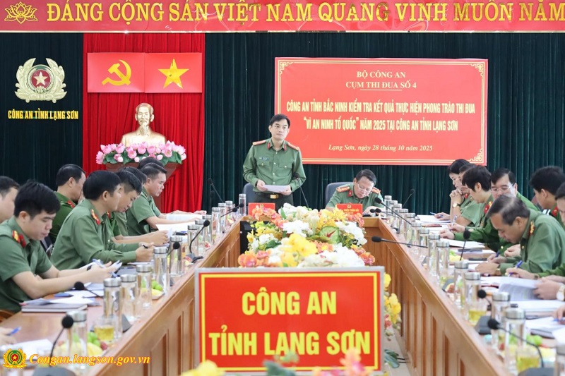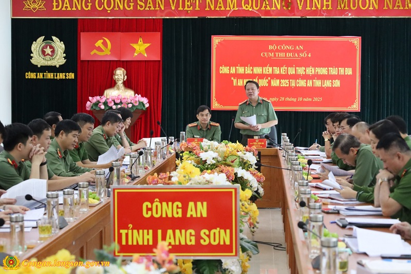 Thực hiện quy chế hoạt động của Cụm thi đua số 4, Bộ Công an, ngày 28/10, tại Công an tỉnh Lạng Sơn, đoàn công tác do đồng chí Đại tá Đỗ Đức Trịnh, Phó Giám đốc Công an tỉnh Bắc Ninh làm Trưởng đoàn đã kiểm tra, đánh giá kết quả triển khai, thực hiện phong trào thi đua “Vì an ninh Tổ quốc” năm 2025 của Công an tỉnh Lạng Sơn. Dự buổi làm việc có Đại tá Triệu Tuấn Hải, Phó Bí thư Đảng ủy, Phó Giám đốc Công an tỉnh Lạng Sơn cùng đại diện lãnh đạo các phòng nghiệp vụ Công an tỉnh.