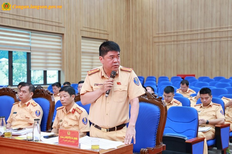 Lãnh đạo Phòng Cảnh sát giao thông phát biểu và giải đáp các ý kiến tham gia thảo luận tại Hội nghị
