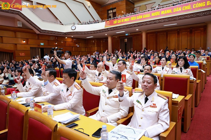 Đoàn đại biểu Đảng bộ Công an tỉnh Lạng Sơn biểu quyết tại Đại hội đại biểu Đảng bộ tỉnh lần thứ XVIII, nhiệm kỳ 2025 – 2030