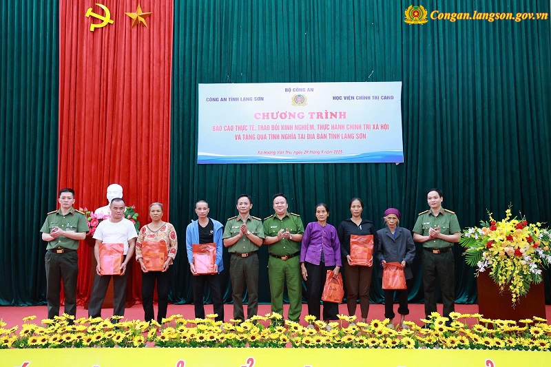 Nhân dịp này, đoàn công tác đã trao 10 suất quà tình nghĩa cho các gia đình chính sách, hộ có hoàn cảnh khó khăn trên địa bàn xã Hoàng Văn Thụ; đồng thời tặng bức tranh lưu niệm của Học viện cho Công an xã Hoàng Văn Thụ, thể hiện tinh thần đoàn kết, sẻ chia và tình cảm gắn bó giữa lực lượng Công an với nhân dân.