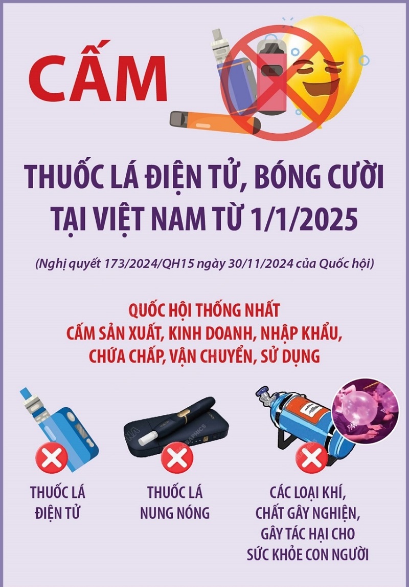 Tại Kỳ họp thứ 8, Quốc hội khóa XV (ngày 30/11/2024), Quốc hội đã thống nhất các nội dung nhằm bảo vệ sức khỏe cộng đồng; theo đó từ năm 2025, Nhà nước cấm sản xuất, kinh doanh, nhập khẩu, chứa chấp, vận chuyển và sử dụng thuốc lá điện tử, thuốc lá nung nóng, shisha, bóng cười và các loại khí, chất gây hại tương tự.