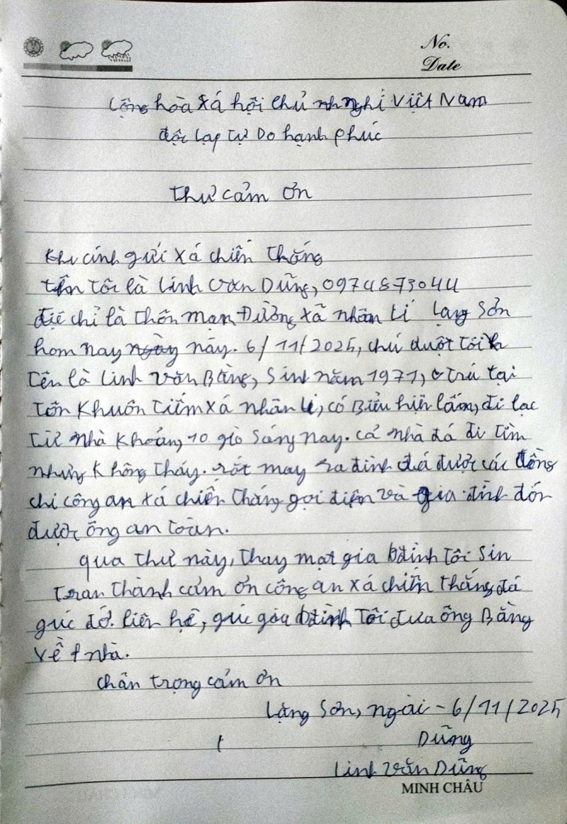 Ngay sau khi tiếp nhận thông tin, lực lượng Công an xã Chiến Thắng đã nhanh chóng có mặt tại hiện trường, tiến hành xác minh, tiếp nhận và đưa về trụ sở để chăm sóc, đảm bảo an toàn cho người đi lạc. Qua xác minh, người đi lạc được xác định là ông Linh Văn Bằng, sinh năm 1971, trú tại thôn Khun Tiếm, xã Nhân Lý, tỉnh Lạng Sơn, đã rời khỏi nhà từ 10h00’ cùng ngày. Sau khi hoàn tất các thủ tục cần thiết, Công an xã Chiến Thắng đã bàn giao ông Linh Văn Bằng cho gia đình đảm bảo an toàn, đúng quy định. Gia đình ông Bằng bày tỏ sự cảm ơn sâu sắc trước tinh thần trách nhiệm, tận tình giúp đỡ của lực lượng Công an xã.