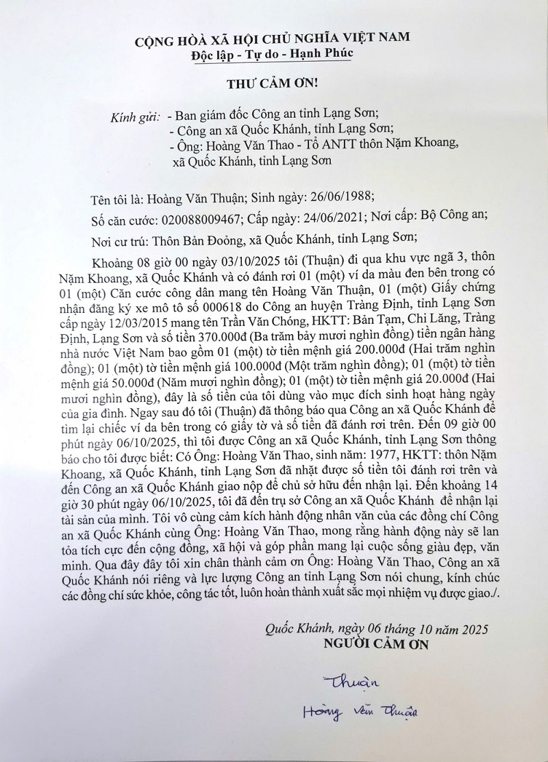 Ngày 06/10/2025, công dân Hoàng Văn Thao (sinh năm 1977, trú tại thôn Nặm Khoang, xã Quốc Khánh, tỉnh Lạng Sơn) đến Công an xã Quốc Khánh trình báo về việc nhặt được một ví da màu đen, bên trong có 01 Căn cước công dân mang tên Hoàng Văn Thuận; 01 Giấy chứng nhân đăng ký xe mô tô và số tiền 370.000 đồng (Ba trăm bảy mươi nghìn đồng) với mong muốn cơ quan chức năng sớm tìm được chủ sở hữu để trả lại.