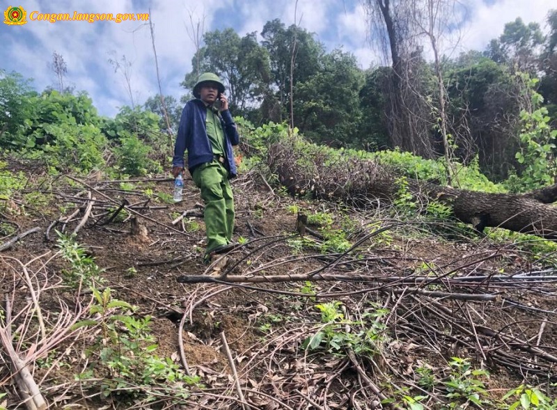 Lực lượng chức năng kiểm tra hiện trường và trao đổi thông tin về vụ hủy hoại rừng tại địa bàn tỉnh Lạng Sơn