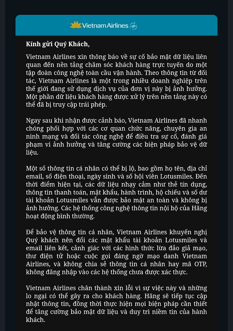 Ngày 14/10/2025, các trang báo điện tử (Vietnamnet, dân trí, ,…) đồng loạt đăng tải thông tin liên quan sự cố rò rỉ dữ liệu từ hãng hàng không quốc gia Việt Nam - Vietnam Airlines (VNA) gây xôn xao dư luận, rất nhiều bình luận lo ngại về công tác bảo mật thông tin khách hàng của các doanh nghiệp lớn, đặc biệt là việc lộ thông tin tại trung tâm Trung tâm Thông tin tín dụng quốc gia (CIC) xảy ra cách đây chưa lâu. Theo các nguồn thông tin thu thập được, các dữ liệu bị đánh cắp bao gồm hơn 23 triệu bản ghi chứa thông tin khách hàng, bản ghi cũ nhất có ngày 23/11/2020, mới nhất ngày 20/6/2025. VNA đã khẩn trương phối hợp với các cơ quan chức năng, đồng thời thông báo về sự cố qua email cho khách hàng, khẳng định các thông tin bị lộ bao gồm họ tên, địa chỉ email, số điện thoại, ngày sinh và số hội viên Lotusmiles. Các dữ liệu nhạy cảm như thẻ tín dụng, thông tin thanh toán, mật khẩu, hành trình, hộ chiếu và số dư tài khoản Lotusmiles vẫn được bảo mật an toàn, không bị ảnh hưởng. Được biết, các thông tin bị đánh cắp trên do nhóm hacker "Scattered LAPSUS$ Hunters" rao bán trên không gian mạng.