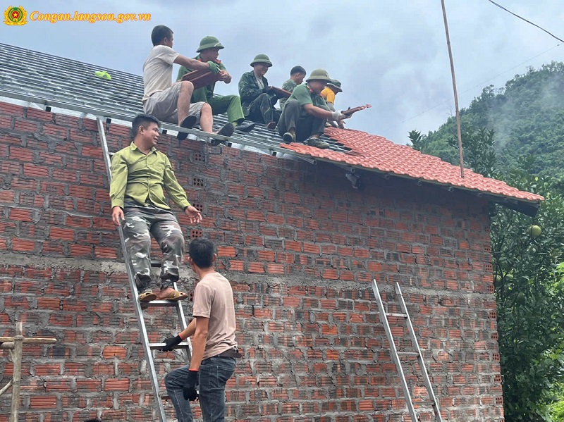 Cán bộ, chiến sĩ Công an xã hỗ trợ hộ dân trong Chương trình “xóa nhà tạm, nhà dột nát” lợp mái nhà