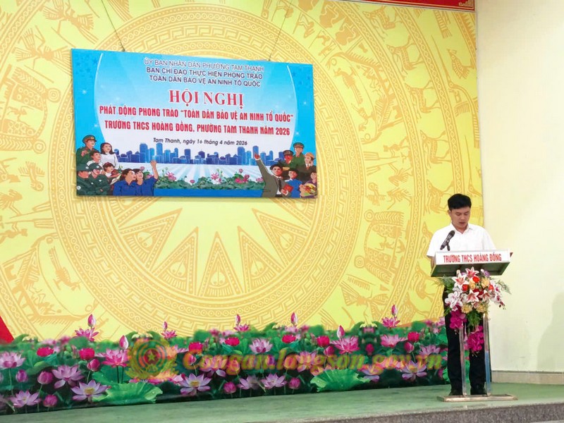 Nhằm nâng cao nhận thức của giáo viên, công nhân viên, phụ huynh và học sinh nhà trường về quyền lợi và nghĩa vụ tham gia bảo vệ an ninh Tổ quốc, sáng ngày 16/4/2026, Ban Chỉ đạo phong trào phường Tam Thanh đã tổ chức thành công Hội nghị phát động phong trào “Toàn dân bảo vệ an ninh Tổ quốc” Trường THCS Hoàng Đồng năm 2026.